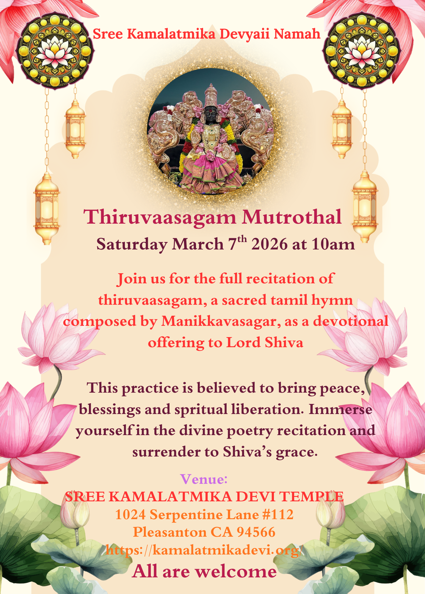 Join us for the full recitation of thiruvaasagam, a sacred tamil hymn composed by Manikkavasagar, as a devotional offering to Lord Shiva